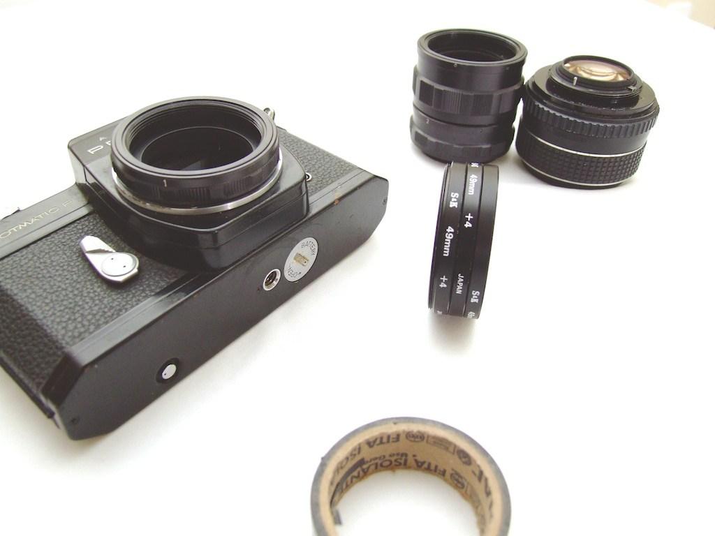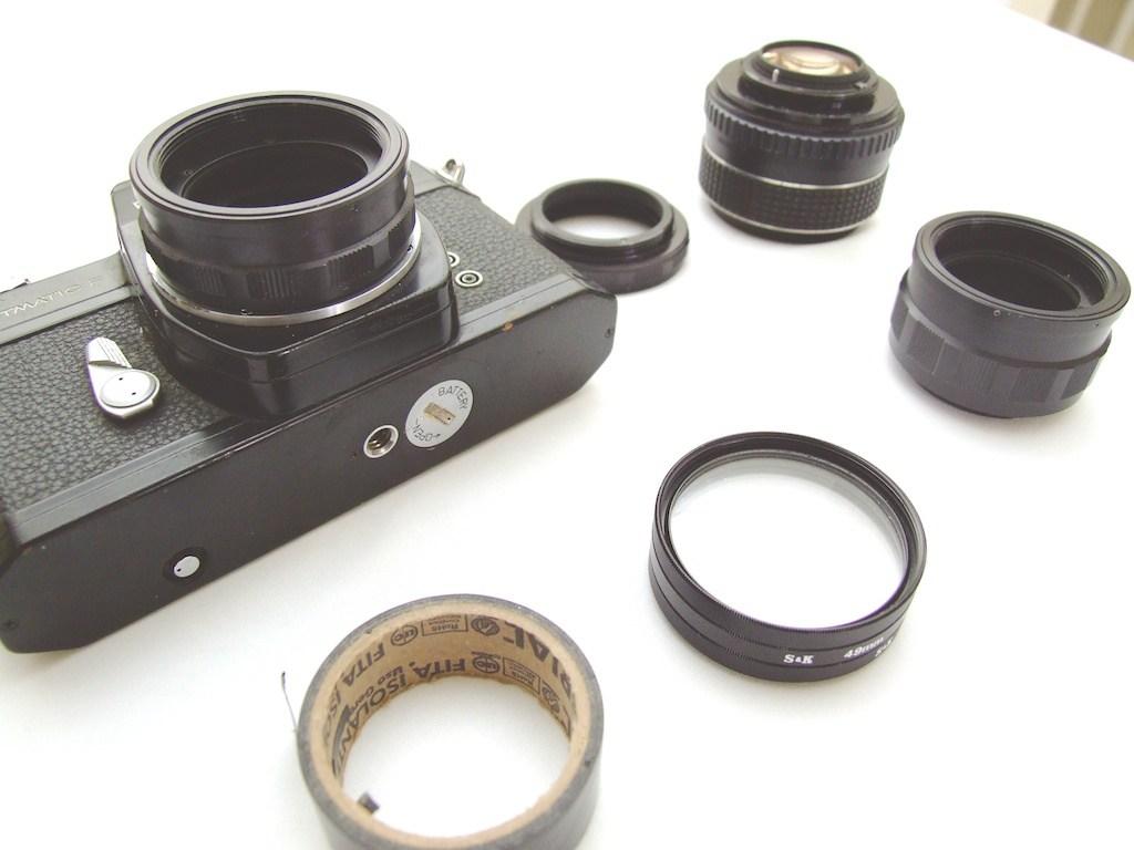 E porque M42? Simples, porque era a que tinha na mão. Eu tinha a câmera e os anéis, não precisava sair pra comprar. Mas a ideia básica é usar um elemento desses kits de anéis de extensão pra macro (compatível com sua câmera, né), uns filtrinhos macro de rosquear na lente e fita isolante. Tudo muito, mas muito simples e acessível. Mais simples que isso seria duas lupas e só fita isolante, mas acho que ia melecar demais nossas queridas SLRs, não?