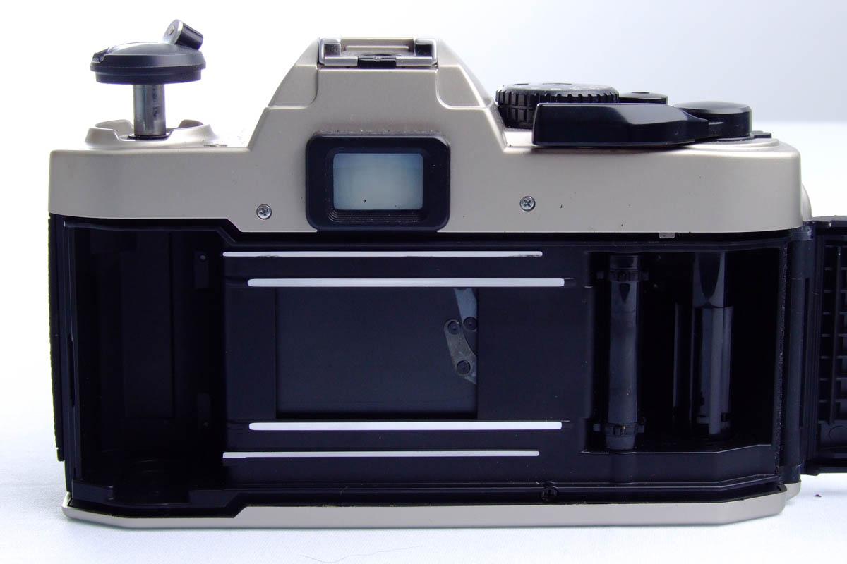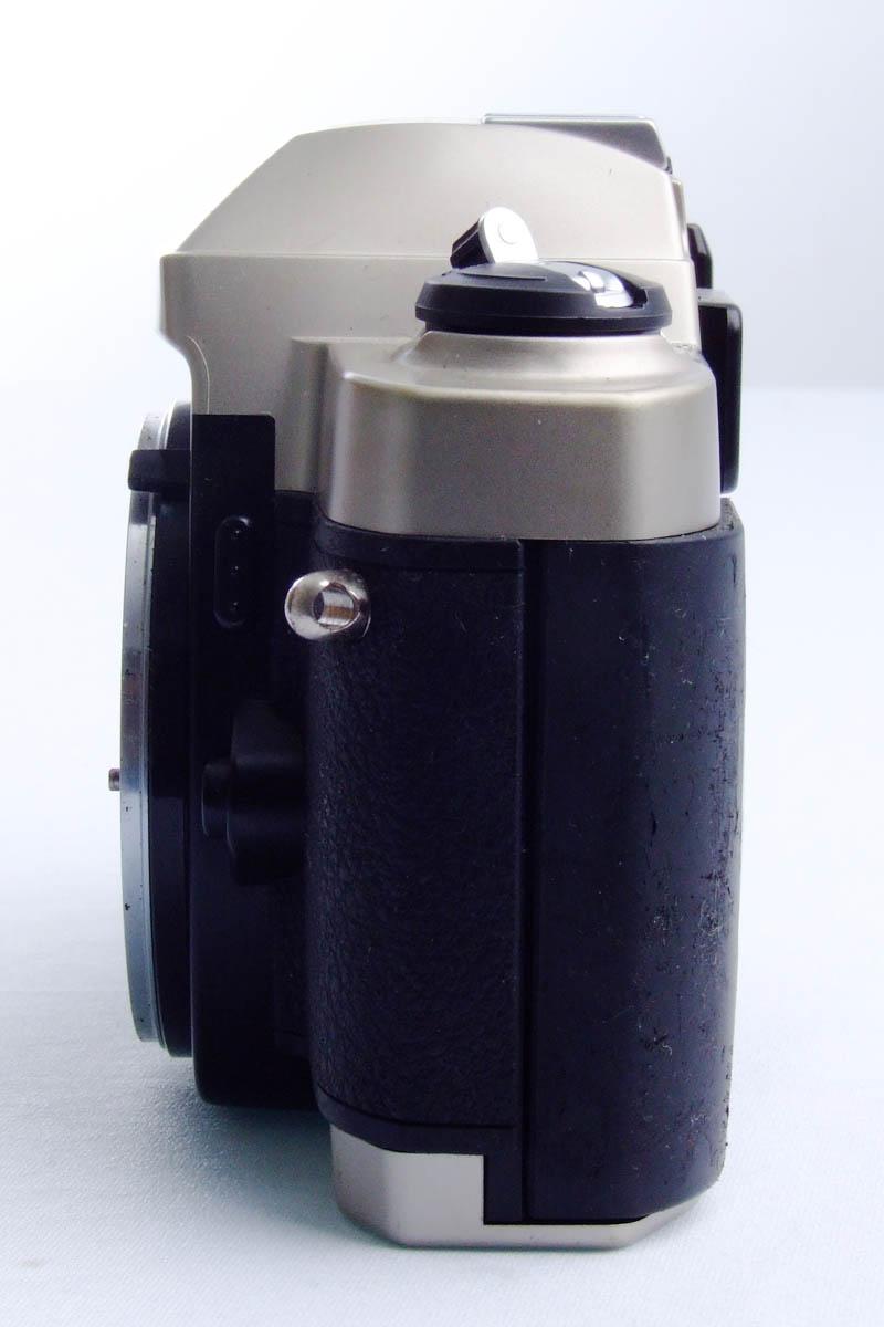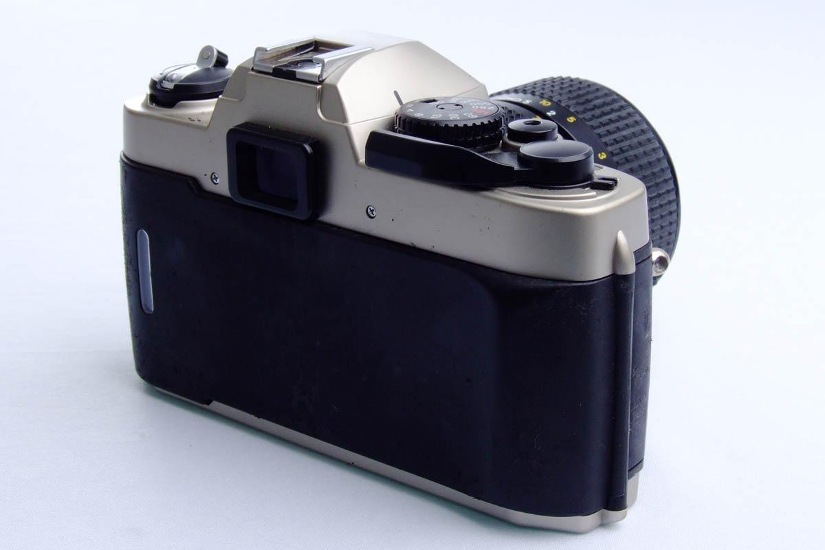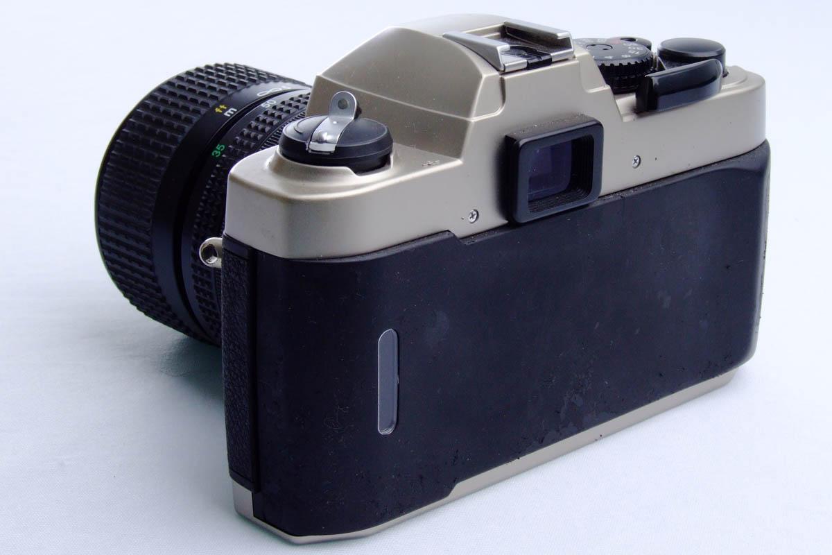 A Nikon FM10 tem aquele acabamento safado emborrachado sobre o plástico da tampa traseira e do “grip”, que descasca com o tempo. A melhor coisa é limpar esse revestimento e deixar no plástico liso de novo.
