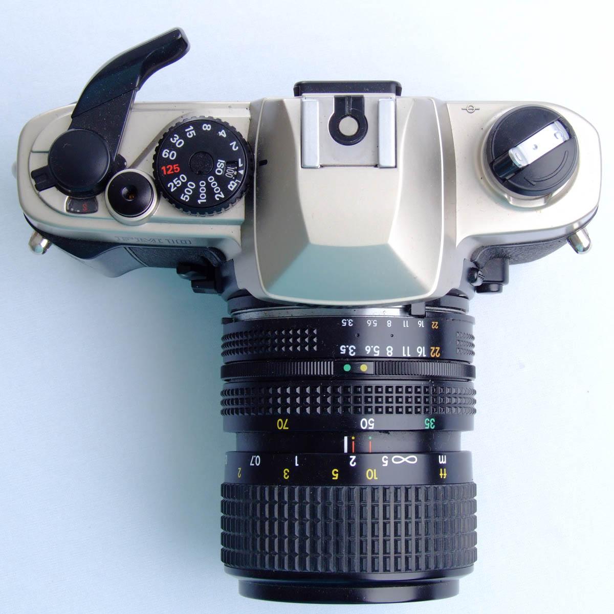 - Visor: Fixo ao nível dos olhos, tipo pentaprisma;